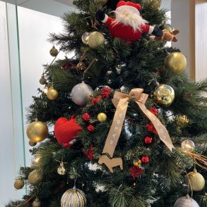 サンタさんの人形やきらきら輝くオーナメントが枝先を彩り、